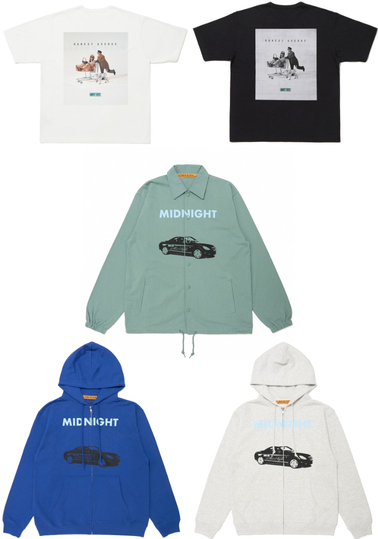 HONEST BOYZ®の2nd Album「HONEST AVENUE」のジャケットビジュアルを落とし込んだTシャツをはじめ、“東京の夜”を舞台にしたシティポップナンバー「Midnight feat. claquepot」の世界観を表現したアイテムがラインナップ。